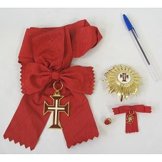 CONJUNTO DE INSÍGNIAS DA ORDEM DE CRISTO, NA GRAU DE GRÃ-CRUZ, COMPOSTO POR: FAIXA EM TECIDO VERMELHO, COM INSÍGNIA NO FORMATO DE UMA CRUZ BIZANTINA EM METAL DOURADO, ESMALTADA EM VERMELHO, COM UMA CRUZ BRANCA EM SEU INTERIOR; UMA PLACA, EM METAL DOURADO, TENDO AO CENTRO MEDALHÃO BRANCO QUE RECEBE MINIATURA DA INSÍGNIA, LADEADA POR RAIOS DOURADOS; UMA FITA COM LAÇO, EM TECIDO VERMELHO, COM MINIATURA DA INSÍGNIA E UM BÓTON CONFECCIONADO NO MESMO TECIDO , COM ARREMATE EM TECIDO AMARELO. ACONDICIONADO EM ESTOJO FORRADO DE NAPA VERMELHA, COM BRASÃO DA REPÚBLICA PORTUGUESA NA TAMPA.