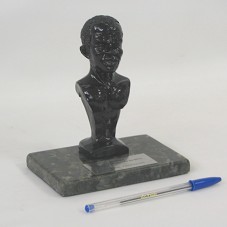 ESCULTURA (14 CM) EM RESINA/GESSO, PINTADA DE PRETO, REPRESENTANDO O BUSTO DE ZUMBI DOS PALMARES. PEÇA FIXADA EM BASE DE MÁRMORE RAJADO E ESVERDEADO, ONDE HÁ PLACA METÁLICA COM A INSCRIÇÃO 'MARISA LETÍCIA LULA DA SILVA / UNIPALMARES - FORMANDOS 2007'.