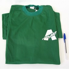 CAMISETA EM MALHA VERDE. NA FRENTE, EM BRANCO, ESTAMPA COM A LETRA 'A' CORTADA POR UM RAMO DE ARRUDA. ATRÁS, 'ARRUDA' E O NÚMERO '10'.