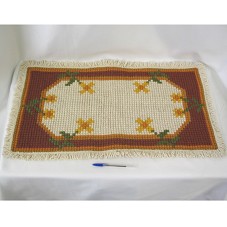 TAPETE (40X73 CM) CONFECCIONADO EM TAPEÇARIA, EM TONS DE MARROM E BEGE, COM DESENHO DE FLORES. POSSUI FRANJAS EM LÃ BEGE. ACOMPANHA ETIQUETA COM INFORMAÇÕES SOBRE O PRODUTO: 'FUNDAÇÃO CRISPIM SANTANA / ... / PROJETO JOVEM ARTESÃO / ALUNA: MARIA / PONTO: HÚNGARO / APOIO: PREFEITURA MUNICIPAL DE ARINOS'.