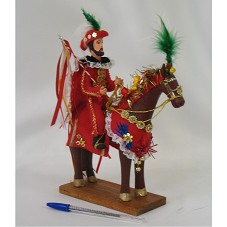 ARTESANATO (25X17X7 CM) CONFECCIONADO EM ARGILA, REPRESENTANDO UM CAVALHEIRO MOURO MONTADO A CAVALO. AMBOS VESTIDOS COM ROUPAS NA COR VERMELHA, ORNADAS COM FITAS, PENAS, MIÇANGAS E LANTEJOULAS. PERSONAGENS DAS 'CAVALHADAS', EVENTO CULTURAL QUE ACONTECE EM PIRENÓPOLIS-GO. NO FUNDO DA BASE, PAPEL COM INFORMAÇÃO SOBRE O EVENTO. ACOMPANHA CARTÃO COM A INSCRIÇÃO 'CASA DO DOCE / ... / LÚCIA FIGUEIREDO / 1ª DAMA / SECRETARIA DA PROMOÇÃO SOCIAL / ... '.
