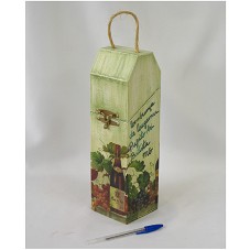 PORTA-GARRAFA (31X9X9 CM) CONFECCIONADO EM MADEIRA, COM TAMPA, FECHO EM METAL E ALÇA EM PALHA. POSSUI PINTURA EM PÁTINA ESVERDEADA E APLICAÇÃO DE DECOUPAGE. EM UMA DAS LATERAIS, A INSCRIÇÃO 'LEMBRANÇA DE LAGAMAR / PREFEITO ARI BATISTA / MG'.