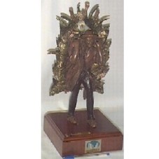 ESCULTURA EM BRONZE E CERA PERDIDA (44X20X20 CM), TENDO COMO TÍTULO 'SILLETERO'. FIGURA MASCULINA DE PÉ, COM TRAJE TÍPICO DA REGIÃO, CARREGANDO UMA LITEIRA NAS COSTAS, CARREGADA DE FLORES. LITEIRA ELABORADA EM CERA ÚNICA. BASE (20X20X6,5 CM) EM MADEIRA, COM UMA PLACA NA FRENTE 'ALCALDÍA DE MEDELLÍN / TRABAJANDO MÁS POR MEDELLÍN', COM SÍMBOLO OVAL DE FUNDO AZUL E TRÊS PRÉDIOS DENTRO. EM CIMA DA BASE, NO CANTO ESQUERDO FRONTAL, UMA PLACA COM O LOGOTIPO DA ARTISTA E SEU NOME 'LUZ MARIA PIEDRAHITA'. ACONDICIONADA EM CAIXA-PEDESTAL DE MADEIRA (55X36X36 CM), COM ALÇAS LATERAIS E FECHO EM FERRO. ACOMPANHA UMA PEQUENA CHAVE, PENDURADA POR UM CORDÃO, EM UMA DAS ALÇAS, E, UMA FOTO DA ESCULTURA NA OUTRA. ESTOJO ACONDICIONADO EM CAIXA DE PAPELÃO.