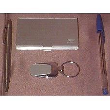 ESTOJO (13 X 16 X 3,5 CM) EM PAPELÃO ENCAPADO EM PAPEL CINZA, CONTENDO UMA CANETA ESFEROGRÁFICA EM METAL PRATEADO, COM CORPO ESCOVADO E PRENDEDOR POLIDO; UM CHAVEIRO TAMBÉM EM METAL PRATEADO ESCOVADO E POLIDO; E, UM PORTA CARTÃO DE VISITA EM METAL PRATEADO ESCOVADO. TODOS OS ELEMENTOS POSSUEM A INSCRIÇÃO 'UNIVALI' E RESPECTIVO SÍMBOLO GRAVADOS. ACONDICIONADOS DENTRO DO ESTOJO, PROTEGIDOS POR ESPUMA CORTADA DE FORMA A ENCAIXAR CADA UM DELES. NA PARTE DE FORA DA CAIXA, UMA FITA LARANJA COM A INSCRIÇÃO 'UNIVALI' REPETIDAS VEZES. ESTOJO EMBALADO EM PAPEL BRANCO. ACOMPANHA CARTÃO DO REMETENTE, EM ENVELOPE AZUL, COM OS DIZERES 'COM CUMPRIMENTOS DE JOSÉ ROBERTO PROVESI / REITOR / UNIVALI / UNIVERSIDADE DO VALE DO ITAJAÍ'