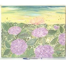QUADRO (40 X 50 CM) COM PINTURA SOBRE TELA RETRATANDO UM CAMPO DE HORTÊNSIAS, NA COR LILÁS, E, AO FUNDO, O POENTE DO SOL, COM ALGUNS PÁSSAROS VOANDO. NÃO POSSUI MOLDURA. POSSUI ASSINATURA DA AUTORA 'BA/03 TATI', NO CANTO INFERIOR DIREITO. ATRÁS, NA MOLDURA DA TELA, PAPÉIS COLADOS COM AS INSCRIÇÕES 'OFICINA DE ARTES / PROF. VILMA SILVEIRA / (PORTADORES DE NECESSIDADES ESPECIAIS) - SALVADOR/BA' E, 'TATIANA SILVA / (OFICINA DE ARTES - PROF. VILMA SILVEIRA) / SALVADOR-BA', AINDA COM O NOME DA AUTORA ESCRITO À TINTA 'TATI SILVA'.