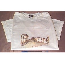 CAMISETA (TAM G) EM MALHA BRANCA, COM MANGA CURTA. NA FRENTE, DESENHO DE UMA RUA E CASAS EM ESTILO BARROCO, EM TONALIDADES DE MARROM. NO CANTO INFERIOR DIREITO A INSCRIÇÃO 'ITABIRA - MG'.