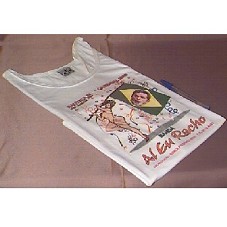 CAMISETA REGATA (TAM G) EM MALHA, NA COR BRANCA. NA FRENTE, O DESENHO DE UMA MULHER COM BIQUÍNI, SEGURANDO A BANDEIRA DO BRASIL, COM A FOTO DO ROSTO DO PRESIDENTE LUIZ INÁCIO LULA DA SILVA DENTRO DA BANDEIRA. AO FUNDO, CONFETES E SERPENTINAS DE CARNAVAL CAINDO. EM CIMA, A INSCRIÇÃO 'NÁUTICA III / SÃO VICENTE - SP / CARNAVAL 2003' E 'BANCA AÍ EU RACHO / COLABORAÇÃO: SINEX PROPAGANDA (13) 3019.4993'.