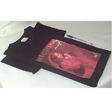 CAMISETA EM MALHA PRETA, DE MANGA CURTA. POSSUI NA FRENTE, FOTO DA CANTORA ALCIONE, E A INSCRIÇÃO 'ALCIONE / ALCIONE / AO VIVO 2 / INDIE RECORDS'. ATRÁS, 'ALCIONE / TOUR 2003'.