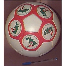 BOLA DE FUTEBOL EM COURO BRANCO. EM CADA LADO, CINCO HEXÁGONOS EM VERMELHO COM O SÍMBOLO DO MST 'MOVIMENTO DOS TRABALHADORES RURAIS SEM TERRA - BRASIL'.