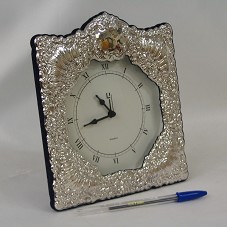 RELÓGIO ANALÓGICO (20X18 CM) DE MESA. POSSUI MOLDURA EM PRATA TRABALHADA E PARTE POSTERIOR FORRADA EM VELUDO AZUL MARINHO. ACONDICIONADO EM CAIXA DE PAPELÃO AZUL, COM NOME DO FABRICANTE NELA. ACOMPANHA GARANTIA E FOLHETO COM INSTRUÇÕES.