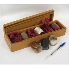 CONJUNTO DE SEIS PORTA-GUARDANAPOS (4X4X3,5 CM CADA), TIPO ANEL, CONFECCIONADOS EM CHIFRE, DE TONALIDADES DIFERENTES. ACONDICIONADO EM ESTOJO DE MADEIRA CURRUPIXÁ (6X29X8,2 CM).