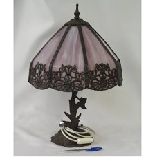 ABAJUR DE MESA (44 CM) CONFECCIONADO EM FERRO. POSSUI BASE E PÉ TRABALHADOS EM FERRO, COM DESENHOS DE FOLHAS E ARABESCOS. CÚPULA COM ARMAÇÃO EM FERRO TRABALHADO E VIDRO LEITOSO COM PINTURA EM TONS DE LILÁS. ACOMPANHA FIO BRANCO, COM PLUG DE TOMADA E INTERRUPTOR.