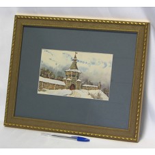 QUADRO (33X40 CM) COM MOLDURA EM MADEIRA LAMINADA EM TONS DE DOURADO; PASSE-PARTOUT EM PAPEL CINZA E TAMPO DE VIDRO. EMOLDURA PINTURA SOBRE PAPEL (13X21 CM) RETRATANDO A FACHADA DE UMA CONSTRUÇÃO COBERTA POR NEVE, COM VEGETAÇÃO AO REDOR. EDIFICAÇÃO EM MADEIRA, COM UMA TORRE CENTRAL E OUTRA NA EXTREMIDADE. NO REVERSO DO QUADRO, ETIQUETA COLADA COM INSCRIÇÕES EM RUSSO. ACONDICIONADO EM CAIXA FORRADA DE NAPA VINHO.