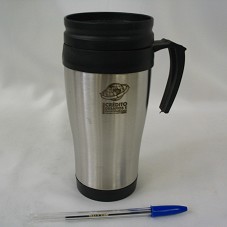 CANECA EM ALUMÍNIO (17 CM), COM A BASE, ALÇA LATERAL E TAMPA COM ROSCA EM PLÁSTICO PRETO. POSSUI NAS LATERAIS A LOGOMARCA DO BANCO DO BRASIL E A INSCRIÇÃO 'WORKSHOP / CRÉDITO, DESAFIOS E OPORTUNIDADES'.
