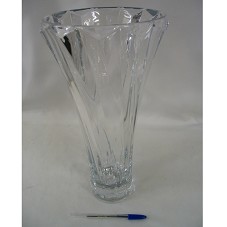 VASO DECORATIVO (36 CM) CONFECCIONADO EM CRISTAL, COM BASE MAIS ESTREIRA QUE PARTE SUPERIOR. POSSUI BASE E TOPO DE FORMATO CIRCULAR, MAS COM FACES TORCIDAS E MULTIFACETADAS.