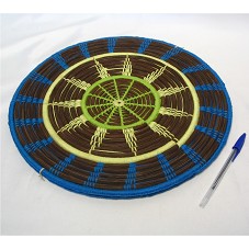 PAR DE SOUSPLAT (35 CM) DE FORMATO CIRCULAR, CONFECCIONADO EM PIAÇAVA E TRANÇADO COM LINHAS NAS CORES AZUL, AMARELO E VERDE. POSSUI ETIQUETA COM INFORMAÇÃO SOBRE O PRODUTO.