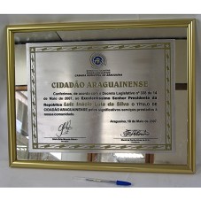 TÍTULO DE CIDADÃO ARAGUAINENSE. PLACA (27X37 CM) EM AÇO ESCOVADO COM A INSCRIÇÃO 'CIDADÃO ARAGUAINENSE / CONFERIMOS, DE ACORDO COM O DECRETO Nº 338 DE 14 DE MAIO DE 2007, AO EXCELENTÍSSIMO SENHOR PRESIDENTE DA REPÚBLICA LUIZ INÁCIO LULA DA SILVA O TÍTULO DE CIDADÃO ARAGUAINENSE PELOS SIGNIFICATIVOS SERVIÇOS PRESTADOS À NOSSA COMUNIDADE / ARAGUAÍNA, 18 DE MAIO DE 2007', COM ASSINATURA DO PRESIDENTE E DA SECRETÁRIA DA CÂMARA. POSSUI MOLDURA EM ALUMÍNIO DOURADO (36,5X47 CM), E PASSE-PARTOUT ESPELHADO.