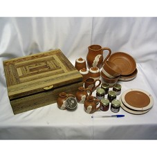 CONJUNTO CERÂMICO COMPOSTO POR: UMA JARRA COM ALÇA (15CM) E UMA MINIATURA DELA (6,5 CM); TRÊS JARRAS PEQUENAS, EM MINIATURA (8 CM CADA), COM BOJO ABAULADO E ALÇA; TRÊS POTES PEQUENOS (10,5 CM, 9,5 CM E 6,5 CM), DE FORMATO CÔNICO, COM TAMPA; DOIS PIRES RASOS (15,5 CM DE DIÂMETRO); DOIS PRATOS FUNDOS (17 CM DE DIÂMETRO); DUAS TIGELAS CÔNICAS FUNDAS (7X10,7X10,7 CM); TRÊS POTES PEQUENOS DE VIDRO, CONTENDO DOCE DE PIMENTA; E TRÊS POTES PEQUENOS DE VIDRO CONTENDO GELÉIA DE TOMATE. TODOS POSSUEM PINTURA EM BEGE CLARO, COM MOTIVOS RUPESTRES. DUAS DAS JARRAS PEQUENAS POSSUEM ETIQUETA 'IPE - INCLUSÃO PRODUTIVA EMPREENDEDORA', DA SECRETARIA DO TRABALHO E DESENVOLVIMENTO SOCIAL DO GOVERNO DE TOCANTINS, COM DADOS DO OBJETO E APRESENTAÇÃO DO PROJETO. ACONDICIONADOS EM CAIXA DE MADEIRA FORRADA COM LÂMINAS DE FIBRA VEGETAL.