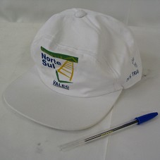 BONÉ EM BRIM BRANCO. NA FRENTE, LOGOMARCA DA FERROVIA NORTE SUL / VALEC. NAS LATERAIS, AS INSCRIÇÕES 'MINISTÉRIO DOS TRANSPORTES' E 'VALEC'; E, ATRÁS 'PAC / PROGRAMA DE ACELERAÇÃO DO CRESCIMENTO'.