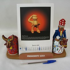 ARTESANATO (15,5X26 CM) CONFECCIONADO EM CERÂMICA. COMPOSTO POR CALENDÁRIO DE MESA COM FOTOGRAFIAS DE ARTESANATOS LOCAIS, RETRATANDO A CULTURA REGIONAL; EM UMA DAS LATERAIS, PORTA-CANETAS NO FORMATO DE BUMBA-MEU-BOI; E, NA OUTRA, UM HOMEM GUIANDO UM BURRO, VESTIDOS TIPICAMENTE. POSSUI A LOGOMARCA DO 'IX FÓRUM DOS GOVERNADORES DO NORDESTE' E O DESENHO DA BANDEIRA NACIONAL, ALÉM DA INSCRIÇÃO 'IX FÓRUM DOS GOVERNADORES DO NORDESTE / PRESIDENTE LULA'. ACONDICIONADO EM CAIXA COM ALÇA (25X30X14 CM) CONFECCIONADA EM SISAL, COM A INSCRIÇÃO 'GOVERNO DE PERNAMBUCO'.