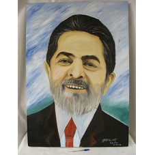 QUADRO (100X70 CM) SEM MOLDURA. PINTURA SOBRE MADEIRA RETRATANDO O PRESIDENTE LULA, EM PLANO AMERICANO. POSSUI FUNDO AZULADO COM BRANCO. NO CANTO INFERIOR DIREITO, ASSINATURA DO ARTISTA 'MARCELLINO SANTOS / 23-12-08'.