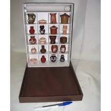 ARTESANATOS CONFECCIONADOS EM CERÂMICA, MINIATURAS DE DIFERENTES TIPOS DE JARROS, VASOS E AROMATIZADORES. ACONDICIONADOS E FIXADOS EM CAIXA DE MADEIRA (33X23 CM) PINTADA DE MARROM, COM DIVISÓRIAS BRANCAS, FORMANDO NICHOS INTERNOS. ACOMPANHA CARTÃO DO GOVERNADOR DO ESTADO DA BAHIA, JAQUES WAGNER. ACONDICIONADO EM CAIXA DE PAPELÃO (8X38X25,5 CM) NA COR VERMELHA.