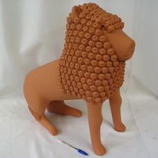 ARTESANATO / ESCULTURA (48X45 CM) CONFECCIONADO EM CERÂMICA. REPRESENTA UM LEÃO SENTADO SOBRE AS PATAS POSTERIORES E COM A JUBA ENCARACOLADA.