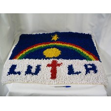 TAPETE (84X71 CM), TIPO CAPACHO, COM DESENHO DA BANDEIRA DO ESTADO DE PERNAMBUCO, CONFECCIONADO COM TIRAS DE MALHA NAS RESPECTIVAS CORES DA BANDEIRA. POSSUI O NOME 'LULA' NA PARTE INFERIOR DO TAPETE.