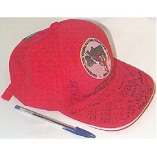 BONÉ NA COR VERMELHA, COM EMBLEMA DO MST E A INSCRIÇÃO BORDADA NA FRENTE DO BONÉ: 'MOVIMENTO DOS TRABALHADORES RURAIS SEM TERRA - BRASIL / REFORMA AGRÁRIA / POR UM BRASIL SEM LATIFÚNDIO', E A BANDEIRA DO BRASIL BORDADA ATRÁS. POSSUI VÁRIAS ASSINATURAS À CANETA ESFEROGRÁFICA NA ABA DO MESMO.