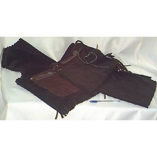 COLETE E CALÇA EM COURO-CAMURÇA PRETO E DETALHES MARRONS, SEM ESPECIFICAÇÃO DE TAMANHO. COLETE ABERTO, SEM MANGA, COM FRANJA EM UM DOS LADOS FRONTAIS, NAS COSTAS E NA BARRA. POSSUI FITA DO PRÓPRIO MATERIAL PARA FECHAMENTO. BOLSO EM COURO MARROM NA PARTE FRONTAL, COM A INSCRIÇÃO 'COOACAL CACHOEIRINHA PE'. NÃO POSSUI COSTURA NAS EXTREMIDADES, APENAS O CORTE DO TECIDO. CALÇA ABERTA, TIPO MONTADOR, COM FRANJA MARROM NAS LATERAIS E DETALHES DO FECHAMENTO EM METAL PRATEADO. POSSUI CÓS EM COURO MARROM, COM A INSCRIÇÃO 'COOACAL / CACHOEIRINHA - PE'; EM UMA PERNA, UM BOLSO NA COR PRETA. ACOMPANHA CARTÃO DO REMETENTE, COM OS DIZERES 'SENHOR PRESIDENTE, O COOPERATIVISMO BRASILEIRO AGRADECE O DECISIVO APOIO RECEBIDO DE VOSSA EXCELÊNCIA. MÁRCIO LOPES DE FREITAS / PRESIDENTE / BRASÍLIA-DF, 04 DE JULHO DE 2003'. ACONDICIONADOS EM CAIXA DE PAPELÃO (42X31,5X21,5 C) NA COR MARROM COM LISTRAS VERMELHAS, COM TAMPA E ORIFÍCIOS LATERAIS SERVINDO COMO ALÇA, E FITA VERMELHA EM FILÓ.