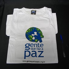 CAMISETA (TAM G) EM MALHA BRANCA, DE MANGA CURTA. NA FRENTE, EM AZUL, VERDE E PRETO, DESENHO DO GLOBO MUNDI EM QUEBRA-CABEÇA, E A INSCRIÇÃO 'GENTE QUE FAZ A PAZ / WWW.GENTEQUEFAZAPAZ.ORG.BR'. ATRÁS, 'AGENTE DA PAZ' E LOGOMARCAS DOS PARCEIROS E INVESTIDORES.