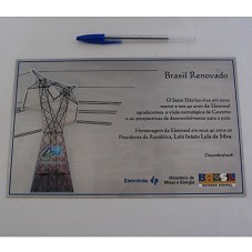 PLACA (17X27 CM) EM AÇO ESCOVADO CONTENDO A INSCRIÇÃO 'BRASIL RENOVADO / O SETOR ELÉTRICO VIVE UM NOVO MARCO E NOS 40 ANOS DA ELETROSUL AGRADECEMOS A VISÃO ESTRATÉGICA DO GOVERNO E AS PERSPECTIVAS DE DESENVOLVIMENTO PARA O PAÍS. HOMENAGEM DA ELETROSUL EM SEUS 40 ANOS AO PRESIDENTE DA REPÚBLICA, LUIZ INÁCIO LULA DA SILVA. DEZEMBRO/2008 / ELETROBRÁS / MINISTÉRIO DE MINAS E ENERGIA / GOVERNO FEDERAL'. NA LATERAL ESQUERDA, ADESIVO COM FOTOGRAFIA DE UMA TORRE DE TRANSMISSÃO. ACONDICIONADA EM ESTOJO FORRADO DE VELUDO PRETO.