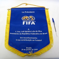 FLÂMULA ( 37X26 CM) EM TECIDO AZUL, COM FRANJAS AMARELAS EM SUA BORDA. POSSUI BORDADO EM BRANCO A INSCRIÇÃO 'LE PRÉSIDENT FIFA / A S. EXA. LUIZ IGNÁCIO LULA DA SILVA / PRESIDENTE DA REPÚBLICA FEDERATIVA DO BRASIL / EM RECONHECIMENTO À SUA CONTRIBUIÇÃO AO FUTEBOL / BRASÍLIA 29 DE JANEIRO DE 2009'. FIXADA EM BASTÃO DE METAL DOURADO.