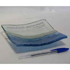 PRATO DECORATIVO (15,5X15,5X2,5 CM), DE FORMATO QUADRANGULAR, COM BORDAS ELEVADAS. CONFECCIONADO EM VIDRO TRABALHADO: POSSUI FAIXA NA DIAGONAL, EM TONALIDADE CINZA, CORTANDO A PARTE CENTRAL DO OBJETO; NA METADE SUPERIOR, TRANSPARENTE, ETIQUETA COM A INSCRIÇÃO 'HIDRELÉTRICA SÃO SALVADOR / TRACTEBEL ENERGIA / GDF SUEZ'; NA METADE INFERIOR, EM TONS DE AZUL, TEXTURA IMITANDO ÁGUA. ACOMPANHA TEXTO DO 'ATELIER SÃO FRANCISCO'. ACONDICIONADO EM ESTOJO AZUL, COM NOME DA EMPRESA NA TAMPA. PEÇA CONFECCIONADA PELO ATELIER PARA A INAUGURAÇÃO DA USINA HIDRELÉTRICA SÃO SALVADOR.