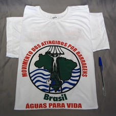 CAMISETA (TAM M) EM MALHA BRANCA, DE MANGA CURTA. NA FRENTE, LOGOMARCA E NOME DO 'MOVIMENTO DOS ATINGIDOS POR BARRAGENS / BRASIL' E A INSCRIÇÃO 'ÁGUAS PARA VIDA NÃO PARA MORTE'. ATRÁS, 'ÁGUA E ENERGIA NÃO SÃO MERCADORIA / ÁGUA E ENERGIA SÃO PARA SOBERANIA'.