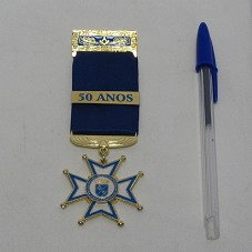 MEDALHA JUBILEU DE OURO. INSÍGNIA COMEMORATIVA AO JUBILEU DE OURO DA 'LOJA MAÇONICA IV CENTENÁRIO'. INSÍGNIA FORMADA PELA CRUZ DE MALTA, NA COR BRANCA E AZUL, COM BORDAS EM DOURADO, TENDO AO CENTRO MEDALHA COM UM BRASÃO QUE LEVA O SÍMBOLO DA MAÇONARIA, RODEADO PELA INSCRIÇÃO 'AUG. E RESP. LOJ. SIMB. IV CENTENÁRIO Nº 102 / 1958-2008 50 ANOS'. PRESA À BARRETA DOURADA, E FITA DE CETIM AZUL ESCURO, COM BARRETA METÁLICA CONTENDO A GRAVAÇÃO '50 ANOS'. ACONDICIONADA EM CAIXA DE PAPEL.