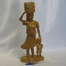 ESCULTURA (43 CM) ENTALHADA EM PEÇA ÚNICA DE MADEIRA CLARA. REPRESENTA UMA MULHER CARREGANDO UMA LATA NA CABEÇA, TENDO UMA CRIANÇA AO SEU LADO. NO FUNDO DA BASE, A INSCRIÇÃO 'FLÁVIO'.