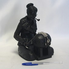 ESCULTURA (20,5X13,5X14 CM) CONFECCIONADA EM ARGILA E PINTADA DE PRETO. REPRESENTA UMA MULHER IDOSA, SENTADA, CONFECCIONANDO RENDA DE BILRO EM UMA ALMOFADA DE TRABALHO. ELA USA PAR DE ÓCULOS E FUMA CACHIMBO. NA LATERAL DIREITA, A INSCRIÇÃO 'EDVALDO SANTIAGO / CM'.