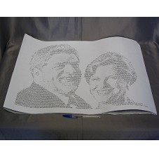 DESENHO (44,5X63 CM) CONFECCIONADO EM CARTOLINA BRANCA E CANETA NANQUIM PRETA, REPRESENTANDO O CASAL PRESIDENCIAL. DESENHO EM NEGATIVO, FORMADO POR LETRAS E SÍMBOLOS. NO CANTO INFERIOR DIREITO, ASSINATURA DO ARTISTA 'RONILSON VIANA'. NO DIREITO, EMAIL DELE '[email protected]'. ATRÁS, DADOS DO ARTISTA E DEDICATÓRIA.