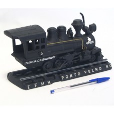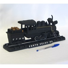 LOCOMOTIVA (12X8X35 CM) CONFECCIONADA EM RESINA E PINTADA DE PRETO. POSSUI ALGUNS DETALHES EM METAL. CARREGA UM VAGÃO COM TORAS DE MADEIRA. NESTE, A INSCRIÇÃO 'EFMM'. NO TRILHO, 'PORTO VELHO-RO'. ACONDICIONADA EM CAIXA (16X37X11 CM) FORRADA DE PAPEL ARTESANAL, TENDO NA TAMPA FOTOGRAFIA DE UMA LOCOMOTIVA E A INSCRIÇÃO 'ESTRADA DE FERRO MADEIRA MAMORÉ / LEMBRANÇA DE PORTO VELHO RO'.