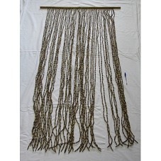 CORTINA PARA PORTA (191X83 CM) CONFECCIONADA COM CINQUENTA E QUATRO CORDÕES FEITOS COM SEMENTES DE AÇAÍ INTERCALADAS COM LOSANGOS DE TIRAS DE JORNAIS ENROLADAS. CORDÕES PRESOS A UM VARÃO ROLIÇO DE MADEIRA (98,5 CM).