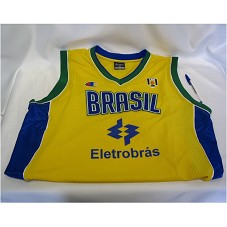 CAMISA DE BASQUETEBOL (TAM XXL) NA COR AMARELA, COM FAIXAS AZUIS NAS LATERAIS. NA FRENTE, 'BRASIL / ELETROBRÁS / CBB'. ATRÁS, BANDEIRA DO BRASIL.