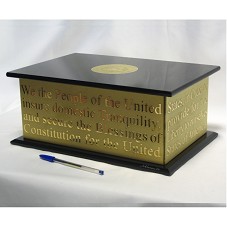 ESTOJO / CAIXA (15X32X20,5 CM). POSSUI TAMPA E BASE EM CRISTAL PRETO, TENDO NA TAMPA O SELO PRESIDENCIAL DOS ESTADOS UNIDOS DA AMÉRICA, GRAVADO EM METAL DOURADO. NA BASE, ASSINATURA DO ARTISTA. LATERAIS EM CRISTAL TRANSPARENTE, COM FACES EXTERNAS COBERTAS POR METAL DOURADO FOSQUEADO, E GRAVAÇÃO DE PARTE DE UM TEXTO DA CONSTITUIÇÃO DE 1787 GRAVADO EM METAL DOURADO POLIDO. ACOMPANHA CARTÃO COM TEXTO SOBRE A O ARTISTA E CARTÃO DE APRESENTAÇÃO DO AGENTE. ACONDICIONADA EM CAIXA DE PAPELÃO FORRADA DE PAPEL DOURADO.
