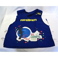 DOIS COLETES DE IDENTIFICAÇÃO, EM TECIDO AZUL MARINHO, COM LATERAIS VAZADAS, PRESAS UMA A OUTRA POR DUAS TIRAS DE ELÁSTICO. NA FRENTE, ESTAMPA MOSTRANDO O PERFIL DE UM HOMEM CANTANDO, COM O GLOBO AO FUNDO, E A INSCRIÇÃO 'RIO CARNAVAL 2009'. NA PARTE SUPERIOR, 'PRESIDENTE' E 'LIESA RIOTUR'. ATRÁS, 'PRESIDENTE / CARNAVAL 2009' E LOGOMARCA DA PREFEITURA DO RIO DE JANEIRO.