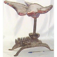 ESCULTURA (38,5X18X43 CM) CONFECCIONADA COM SUCATA DE FERRO. FIGURA UM PÁSSARO CAÍDO, EM CIMA DE UMA LANÇA, QUE POSSUI NA BASE PEDAÇOS DE CARVÃO. DORSO DA AVE REVESTIDO COM TECIDO PINTADO DE FAIXAS AZUIS E VERMELHAS, DEIXANDO ALGUNS PEDAÇOS EM BRANCO. NO PEITO DA MESMA, AS INSCRIÇÕES E ASSINATURA DO ARTESÃO: 'A PAZ NO BRASIL / PELA FOME E A PAZ MUNDIAL / CIRIANI / UBERABA / MG'.