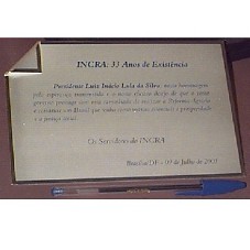 PLACA (18X12 CM) EM METAL PRATEADO ESCOVADO, COM BORDA POLIDA E UMA DAS PONTAS DOBRADAS. TRAZ INSCRIÇÃO GRAVADA EM AZUL: 'INCRA: 33 ANOS DE EXISTÊNCIA / PRESIDENTE LUIZ INÁCIO LULA DA SILVA: NOSSA HOMENAGEM PELA ESPERANÇA TRANSMITIDA E O NOSSO EFUSIVO DESEJO DE QUE O VOSSO GOVERNO PROSSIGA COM ESSA CAMINHADA DE REALIZAR A REFORMA AGRÁRIA E CONSTRUIR UM BRASIL QUE TENHA COMO MARCAS ESSENCIAIS A PROSPERIDADE E A JUSTIÇA SOCIAL. / OS SERVIDORES DO INCRA / BRASÍLIA/DF - 09 DE JULHO DE 2003'. ACONDICIONADA EM CAIXA (23X17X3 CM) FORRADA DE LYCRA PRETA.