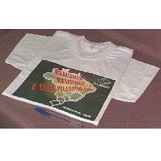 CAMISETA (TAM G) EM MALHA BRANCA, COM MANGA CURTA. NA FRENTE, O DESENHO DO MAPA DO BRASIL, EM FUNDO QUADRADO VERDE, COM AS INSCRIÇÕES 'REALIZAÇÕES RESISTÊNCIA E LUTA PELA REFORMA AGRÁRIA / INCRA 33 ANOS / ASSERA/BR'.