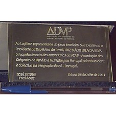 PLACA (13,5X8,5 CM) EM ESTANHO (98%), PRATEADA, COM A INSCRIÇÃO 'ADVMP ASSOCIAÇÃO DOS DIRIGENTES DE VENDAS E MARKETING DE PORTUGAL / AO LEGÍTIMO REPRESENTANTE DO POVO BRASILEIRO, SUA EXCELÊNCIA O PRESIDENTE DA REPÚBLICA DO BRASIL, LUIZ INÁCIO LULA DA SILVA, O RECONHECIMENTO DOS EMPRESÁRIOS DA ADVMP - ASSOCIAÇÃO DOS DIRIGENTES DE VENDAS E MARKETING DE PORTUGAL PELA VISÃO CLARA E OBJETIVA NA INTEGRAÇÃO BRASIL-PORTUGAL. / JOSÉ ZETUNE PRESIDENTE / LISBOA, 08 DE JULHO DE 2003'. MOLDURA GRAVADA NA PRÓPRIA PLACA, EM BAIXO RELEVO PRETO. NA PARTE POSTERIOR 'MENFER ESTANHO PURO 98%'. ACONDICIONADA EM CAIXA (16X12,5X2,5 CM) DE PAPELÃO FORRADA DE AZUL COM RAJADOS PRETOS E LINHA DOURADA NO PERÍMETRO DELA. ACOMPANHA CARTÃO DE VISITA DO REMETENTE 'JOSÉ ZETUNE / PRESIDENTE'.