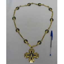 MEDALHA DA ORDEM DO MÉRITO MARECHAL RONDON, CONFECCIONADA EM METAL DOURADO. FORMATO DE UMA CRUZ COM BRAÇOS IGUAIS, TENDO AO CENTRO A EFÍGIE DO MARECHAL, RODEADA PELA INSCRIÇÃO 'MÉRITO MARECHAL RONDON'. MEDALHA PRESA À COLAR COMPOSTO POR MOEDA COM MESMA EFÍGIE E INSCRIÇÃO, INTERCALADA POR PLAQUETAS COM FIGURAS DE RAMOS E O BRASÃO DE RONDÔNIA. ACONDICIONADA EM ESTOJO FORRADO DE VELUDO AZUL MARINHO.