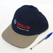 BONÉ EM TECIDO AZUL MARINHO, COM ABA OCRE. NA FRENTE, BORDADO EM BRANCO E VERMELHO, 'BOSCH TECNOLOGIA PARA A VIDA', E LOGOMARCA.